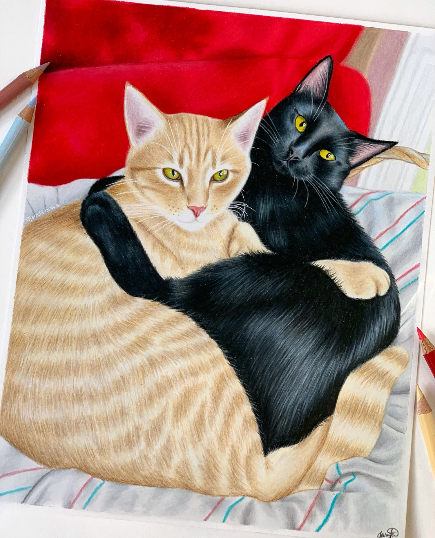 “Jamila’s work has been beyond my expectations. She had captured the expression and personality of my pets. Her artwork is my favorite in my home because of the emotion it evokes. I had Jamila draw my 2 greyhounds and 3 cats and I cherish them. I also had her draw my sister’s dog who passed away unexpectedly and she loves it. I can’t express my love of Jamila and her art. She was such a joy to work with. I look forward to getting more pets forher to capture with her talents.”