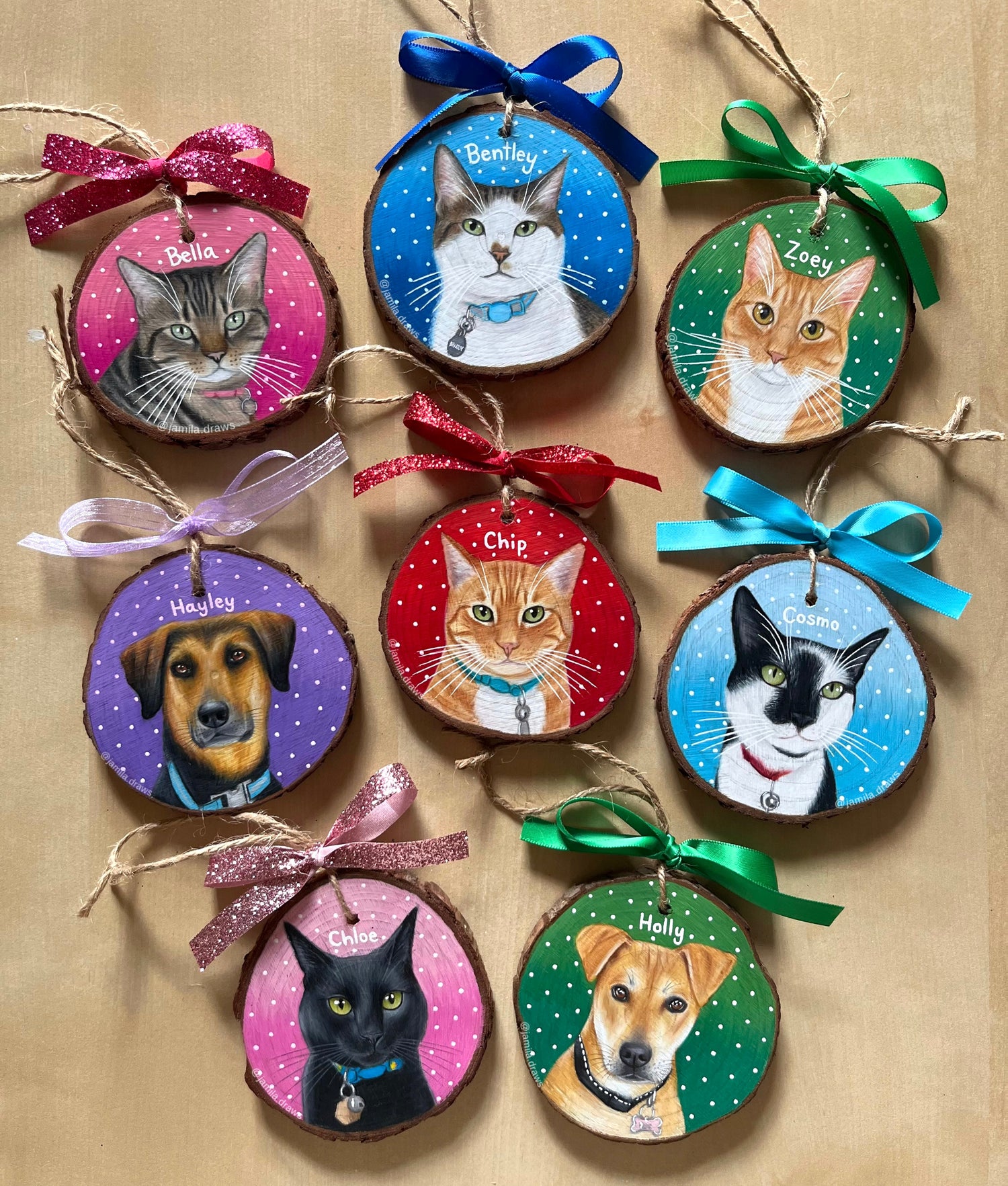 “I cannot recommend Jamila highly enough! Her talent is incredible and I will always treasure the ornaments of my feline fur babies. Her communication was wonderful, prices more than fair, and attention to detail exquisite. I will certainly be gifting pet portraits/ornaments in the future for friends and family.”