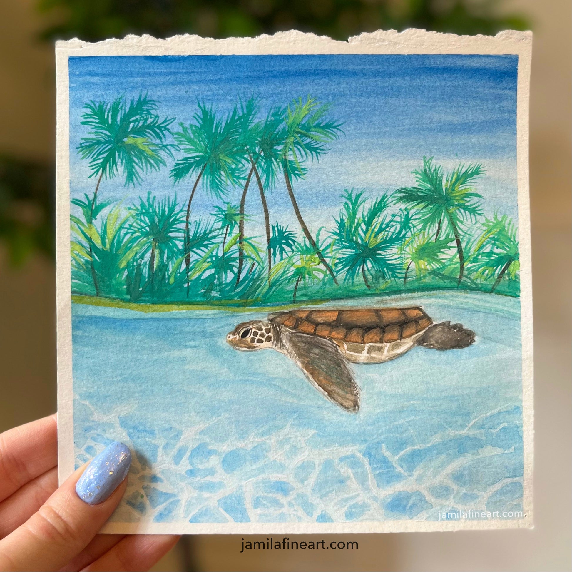 “Underwater” is an original mini watercolor painting of a sea turtle swimming along a tropical beach.